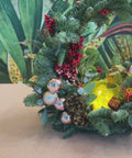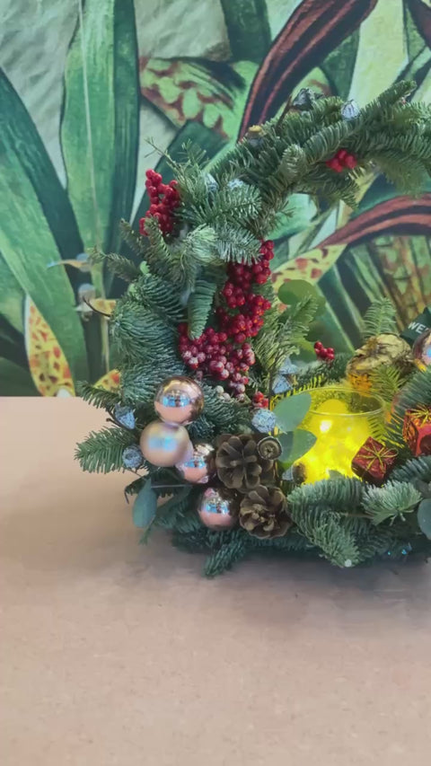 Add a touch of festive enchantment with our carefully crafted crescent-styled Christmas arrangement. Designed with fresh lush pines, berries, pinecones and pink gold bauble ornaments!