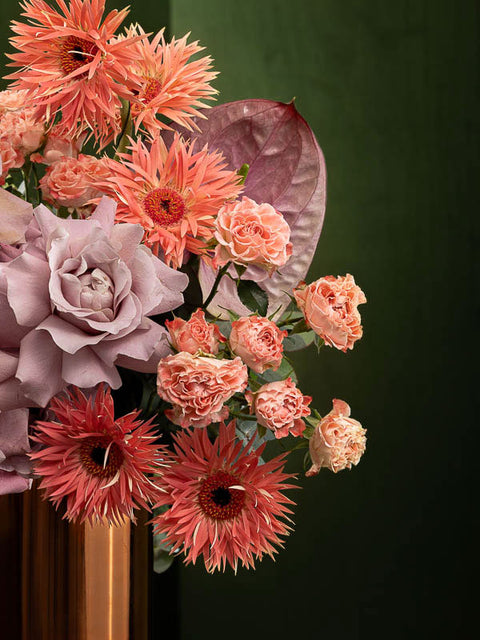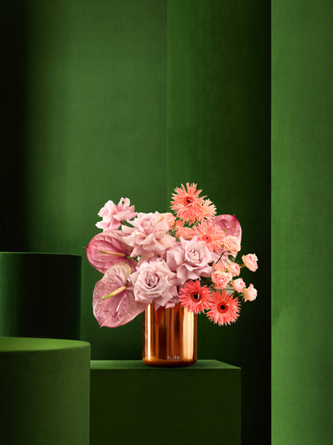 这款粉色花卉礼品的灵感来自大胆的女性,并配有青铜花瓶和